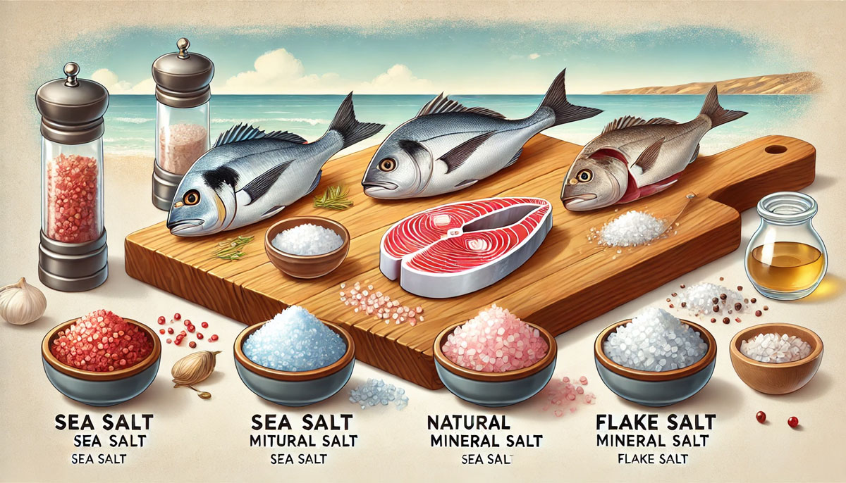 木製のまな板の上に新鮮な魚の切り身が並べられ、それぞれに適した塩(海塩、天然ミネラル塩、フレークソルト)が小皿に盛られて配置されたイラスト。背景には、海沿いのキッチンをイメージした柔らかな自然光が広がり、魚料理と塩の関係を表現したデザイン。